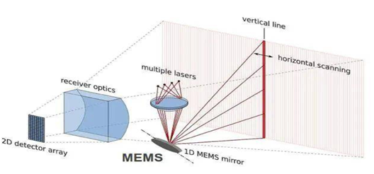 MEMS technology miniaturizes and digitizes mechanical structures, integrating previously larger mechanical structures onto silicon-based chips through microelectronic processes. The LiDAR uses MEMS micro mirrors to achieve scanning of the vertical plane, while the entire machine rotates 360 degrees horizontally to complete horizontal scanning.